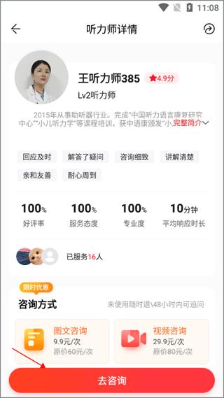 4、这时候会显示有很多的问诊方式,点击私人听力师的“去咨询”,支付一定的金额之后就可以成功添加私人听力师了。