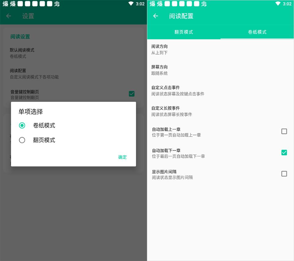重点是,每种翻页模式下你还能进行更细节的配置,比如是否用音量键控制翻页,阅读方向、自定义点击或长按的阅读动作、自动加载等等。