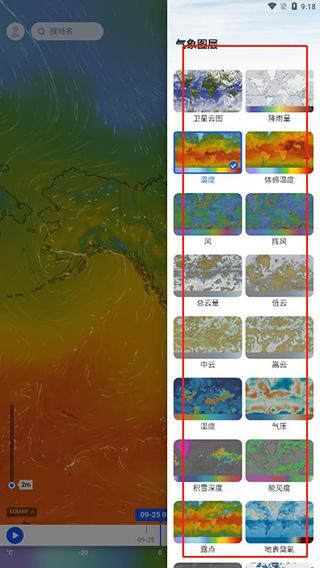 2、里面提供了多种气象图层分类,比如卫星云图、降雨量、温度、体感温度、风等等,选择你喜欢的图层;