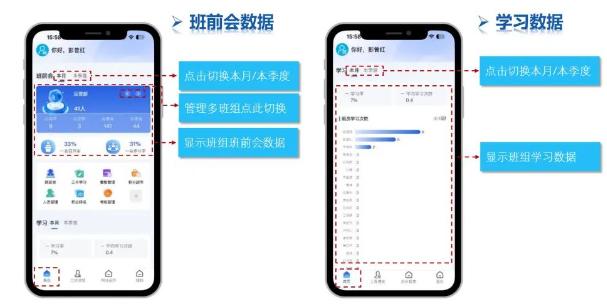 2、首页默认展示本月数据,点击“本季度”可查看当前班组本季度数据:若管理多个班组可通过点击班组名称右侧的箭头切换,进行多班组数据管理