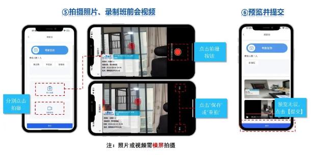 5、分别点击照片拍摄和视频,拍摄一张班前会集体照和录制班前会视频:拍摄完成后,点击“保存”;预览拍摄内容,确认无误后点击“提交