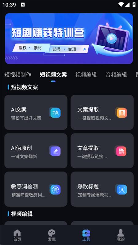 7、在工具页面为大家提供了短视频制作、短视频文案、视频编辑、音频编辑等超多工具可以使用
