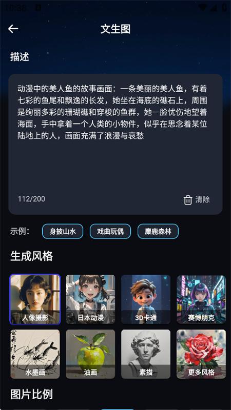 输入一段画面描述,并选择你喜欢的风格,便可以生成一张令你满意的艺术画作。