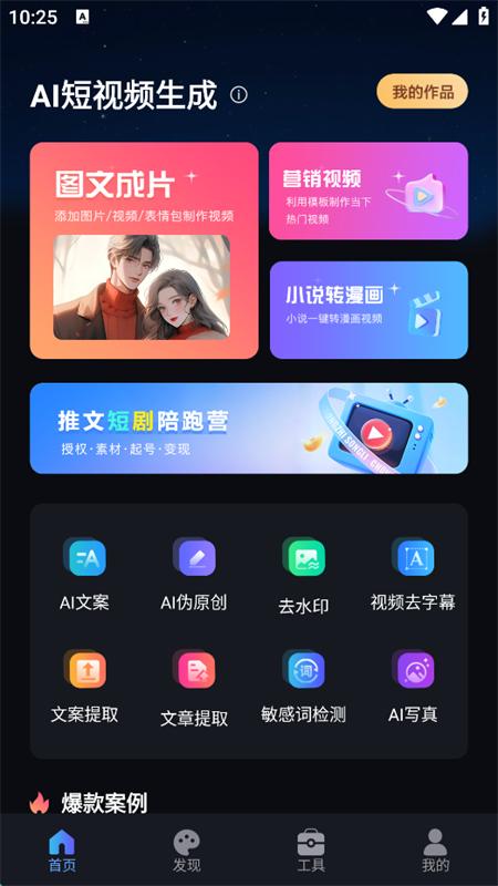 AI短视频生成是一款多功能工具软件,具有图片成文、小说转漫画、AI文案、AI绘画、AI证件照、去水印、视频去字幕、文案提取等功能,轻松帮您一键生成你所需的内容,有这方面需求的用户快来下载一个吧。