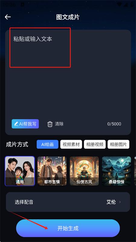 3、点击图文成片,粘贴或输入文本,选择好成片方式等,点击开始生成即可