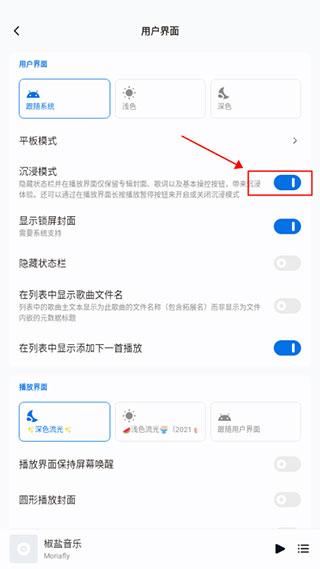 在用户界面设置中,找到沉浸模式,点击后面的开关按钮,如图所示: