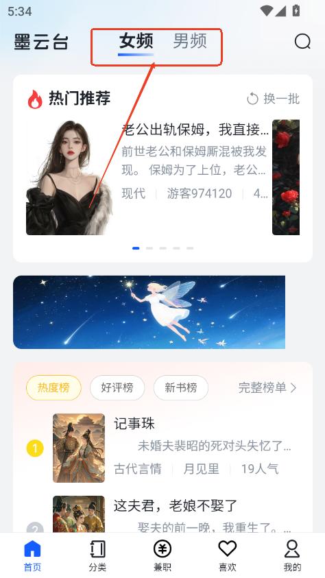 1、进入首页,可以切换男频,或者女频