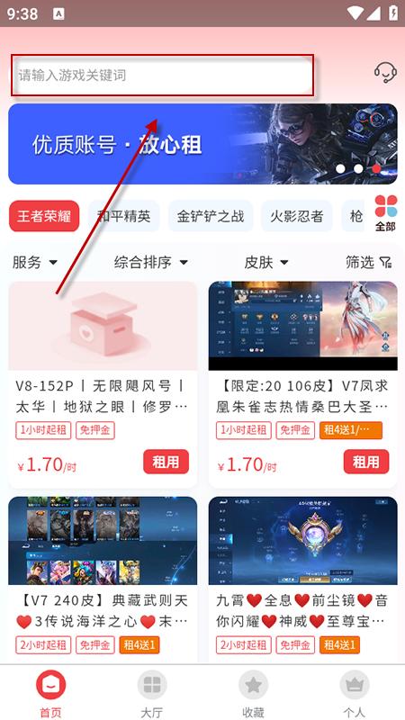 2、也可直接在搜索栏输入游戏关键词或热搜词,快速筛选出所需游戏账号。