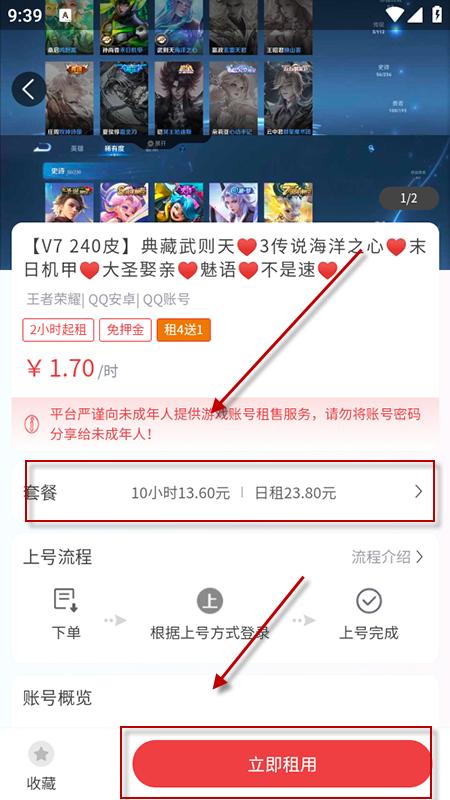 4、根据自己的需求选择租赁时长和对应的套餐,如1小时起租、10小时套餐等,确认后点击“立即租用”进行下单。