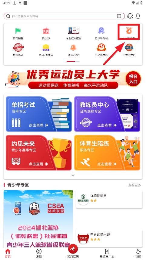 体教联盟app分为三大服务板块:运动员、教练员、教学机构。