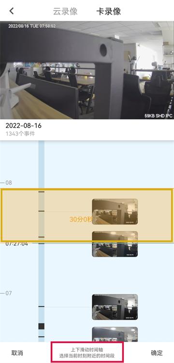 方式一:打开APP,进入【回看】的【卡录像】页面,将时间轴滑动到想要下载的时间点,点击底部【下载】,可以上滑或下滑时间轴,支持30分钟内的录像进行下载。