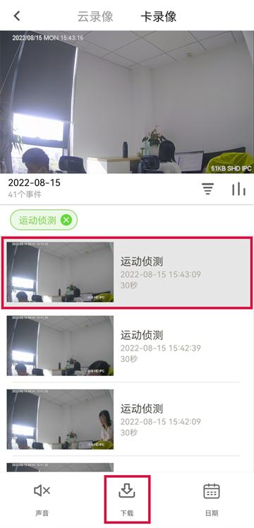 方式二:打开APP,进入【回看】的【卡录像】页面,点击筛选报警事件,选择想要下载的报警事件,点击底部【下载】,下载该事件的录像。