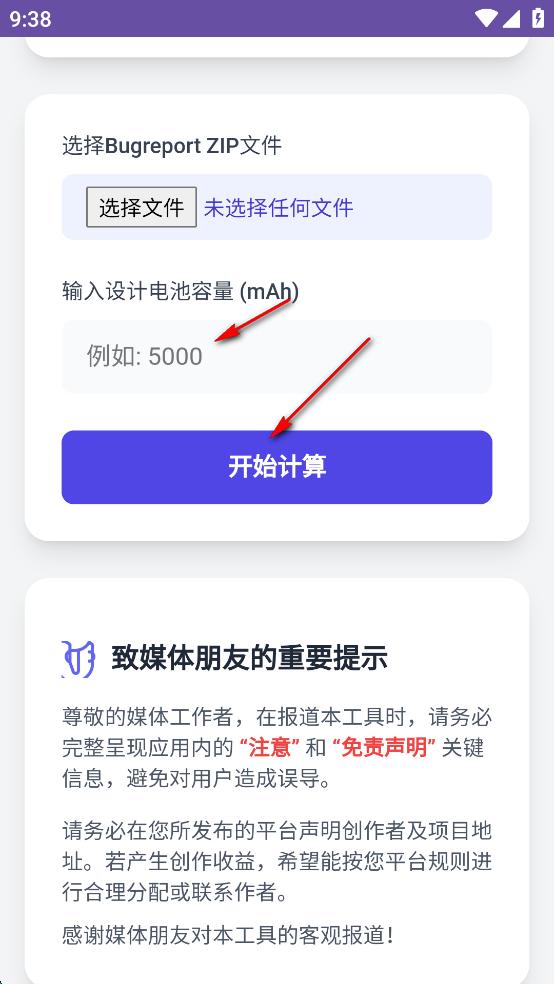 输入您设备的【设计电池容量】(可在网上查询或查看手机参数)。点击【开始计算】,即可看到结果。
