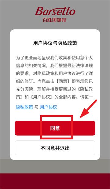 下载安装并打开百胜图咖啡app,先同意用户协议与隐私政策