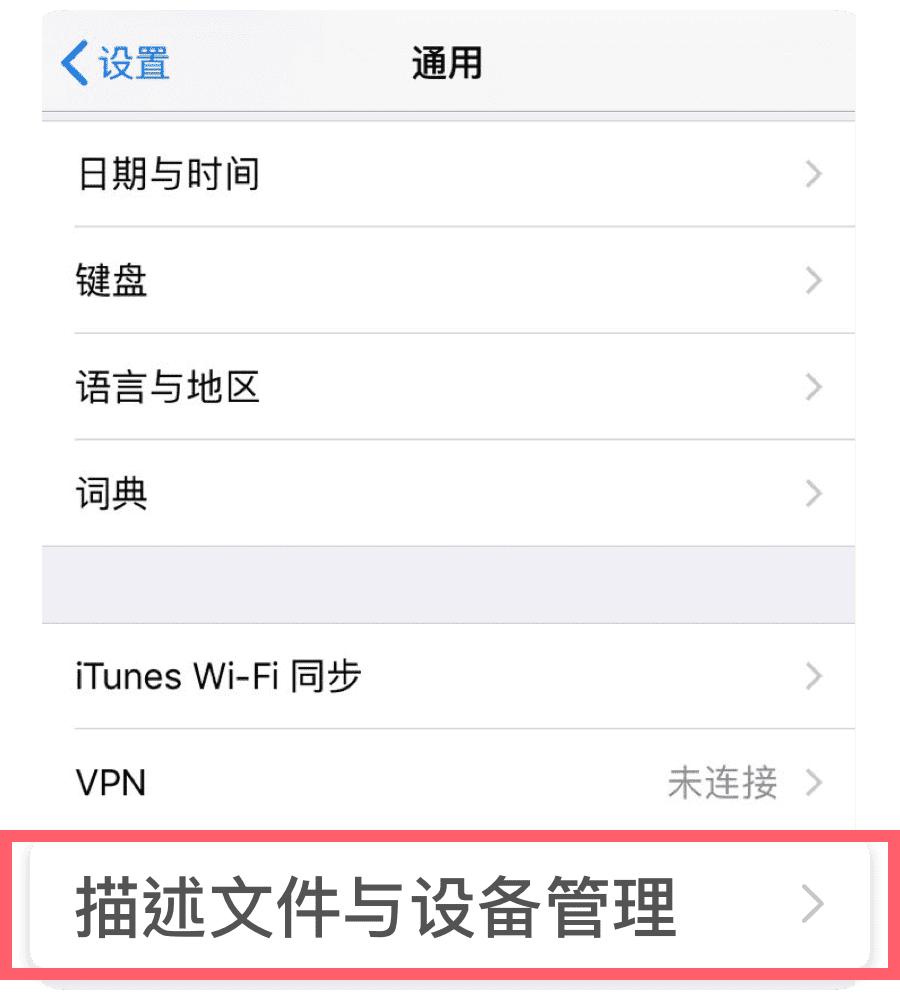 第三步:进入通用,点击 描述文件与设备管理