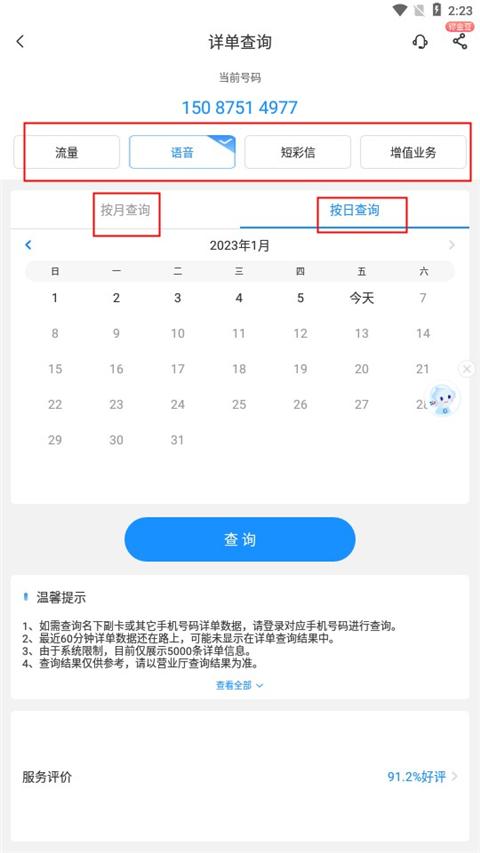 4、进入查询后,可选择流量、语音和短信,”语音“即为通话记录。每个电话通话时常都能找到。