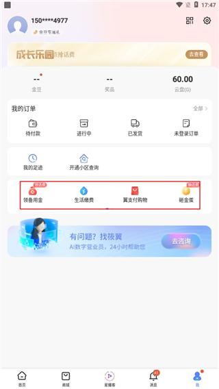 5、点击进入我的,这里为用户提供了备用金、生活缴费、翼支付购物等快捷入口。