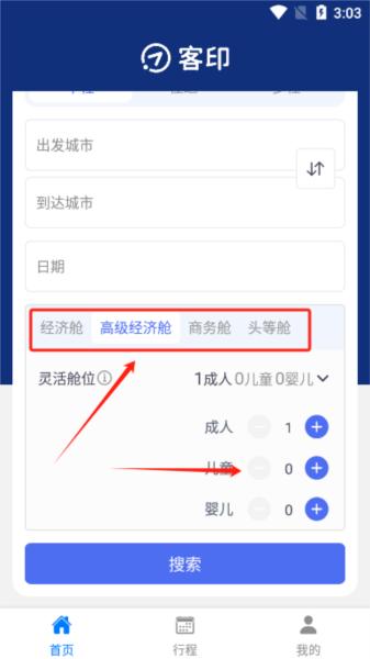 2、此外,你还需要选择好你所需要的舱位和具体人数特征