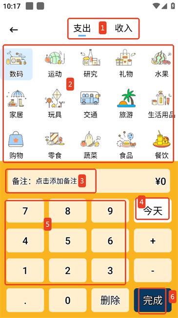 3.选择支出/收入分类选择标签可根据需要选择是否需要添加标签选择日期输入金额最后点击完成