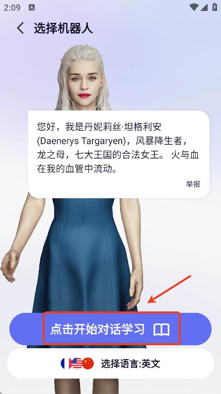 选择虚拟人后,点击“点击开始对话学习”开展特定场景的对话训练