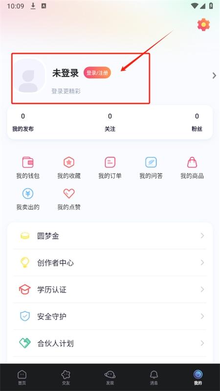 2、打开进入主页,在我的页面点击登录/注册