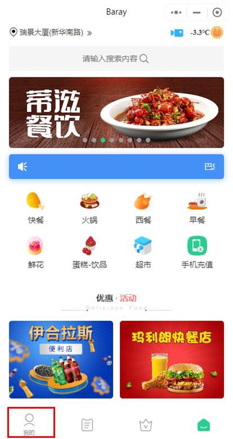 1、安装并打开baray外卖app之后点击右下角【我的】进入页面。