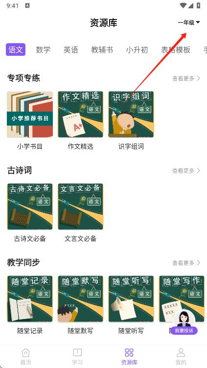 1、我们在资源库页面点击右上角的年级按钮