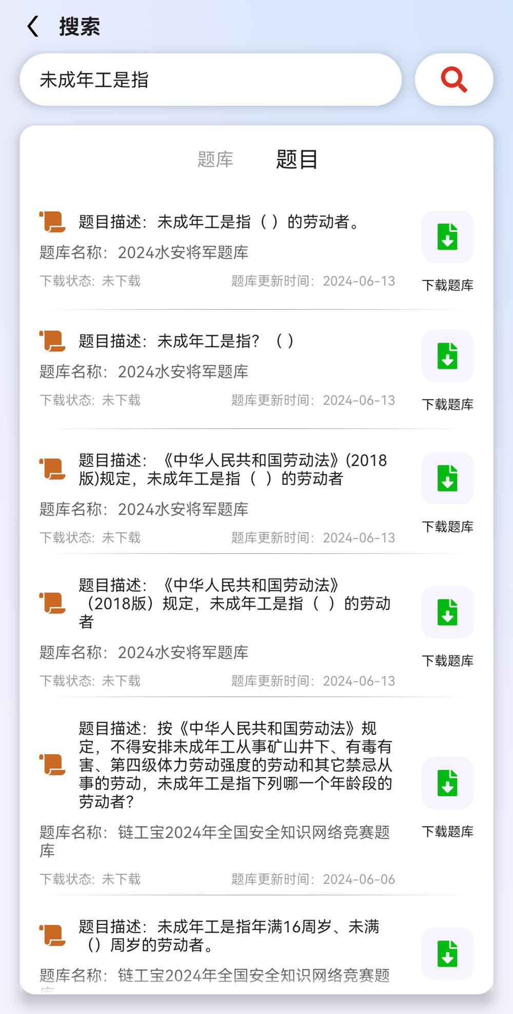 通过“题库广场”页面顶部搜索框,我们可以输入题库名称搜索,也可以输入题目描述搜索。假设我们搜索题目“未成年工是指”
