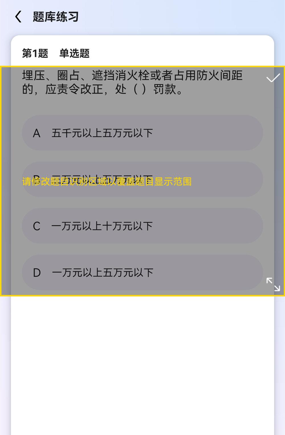 首先需要确定图文识别范围,拖动右下角图标改变悬浮窗大小,使悬浮窗区域覆盖题目范围,点击右上角对号图标确认。