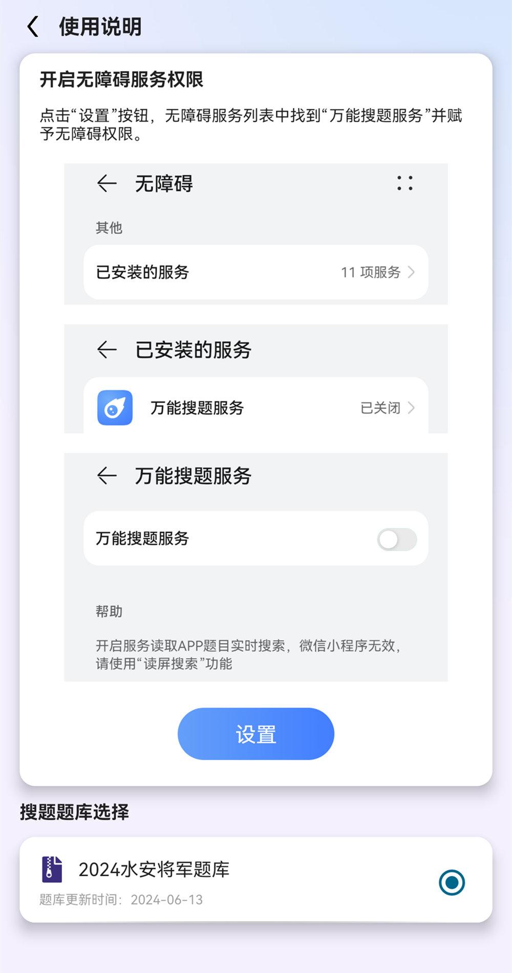 极速搜题通过系统无障碍服务能力读取屏幕内容,适合识别APP类答题。选择我们需要搜索的题库,点击“设置”按钮,按照屏幕提示授予应用权限。