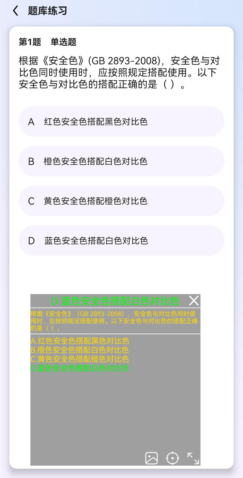 应用开始识别屏幕内容,悬浮窗展示匹配题目。注意悬浮窗不要放到题目范围内,右下角“图片”按钮点击后可以查看当前识别图片区域,右下角“瞄准”按钮点击后可以跳转OCR识别范围。