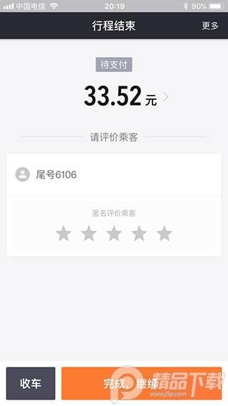 12、所有流程结束后,你可以看到你收款的支付情况,待支付还是已支付,还可匿名评价乘客,如果你想继续接单就点击完成继续接单,如果你今天不想跑了,那就点击收车,系统就不会给你派单了。
