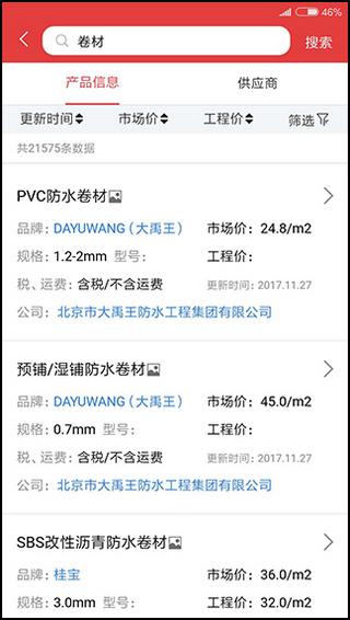 2、在搜素框输入你想要的建材相关名字,可以快速检索产品