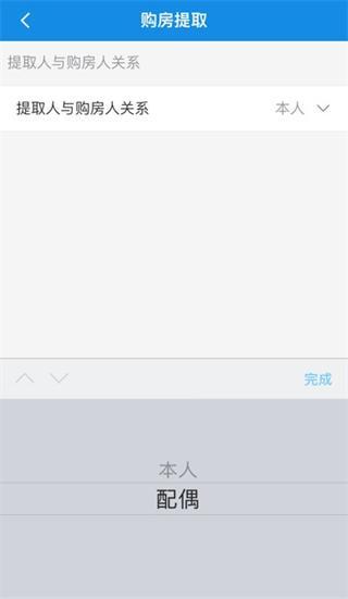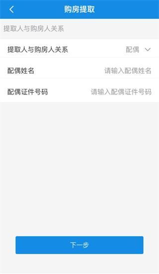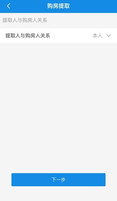 2、点击【我已阅读并接受】后进入办理业务页面,根据实际情况选择提取人与购房人关系:若您本人提取,则如下图所示,若您配偶提取,则需要填写配偶姓名及配偶证件号码,如下图所示。