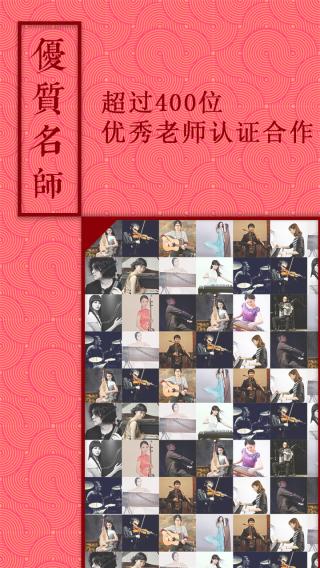 超过400位合作音乐老师。其中包含有新加坡国际钢琴比赛冠军张贺,第二节“欧米勒”全国钢琴比赛冠军刘昱飞,古筝专业硕士于翰泓,第五届香港国际小提琴大赛季军杨博文等等诸多优秀老师。
