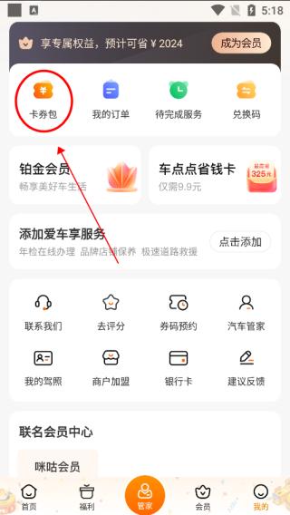 2、然后选择“卡券包”中的洗车券。