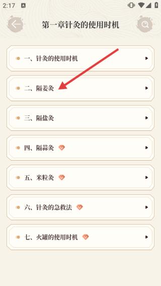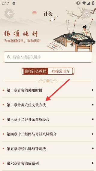 2、在针灸页,选择章节,进入章节详情。