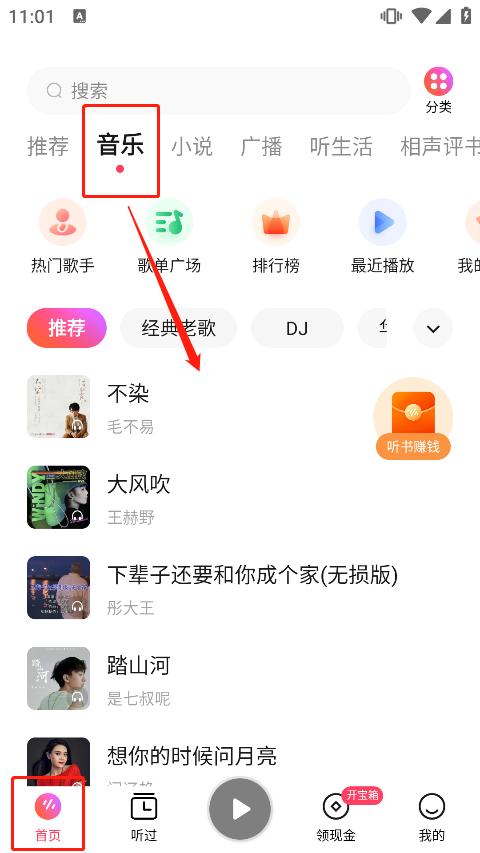 1、进入app“首页”在“音乐”板块内找到需要下载的目标音乐