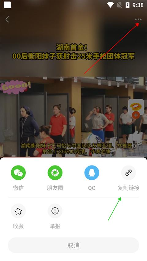 1、用户在观看视频时可以在播放页面中点击右上角的扩展图标(下图红色箭头所指),然后在底部弹出的工具选项中点击【复制链接】(下图绿色箭头所指)