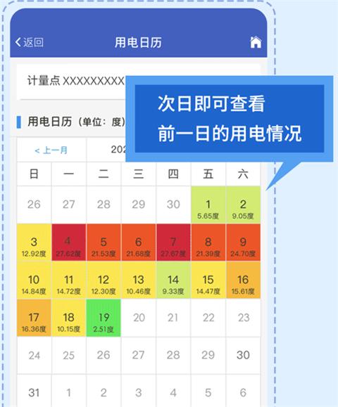 2、在“用电日历”上,你家每天的用电量还会被绿黄橙红4种不同的颜色标注,如:0-5度是绿色、25度以上是红色......用电情况、用电高峰一目了然。