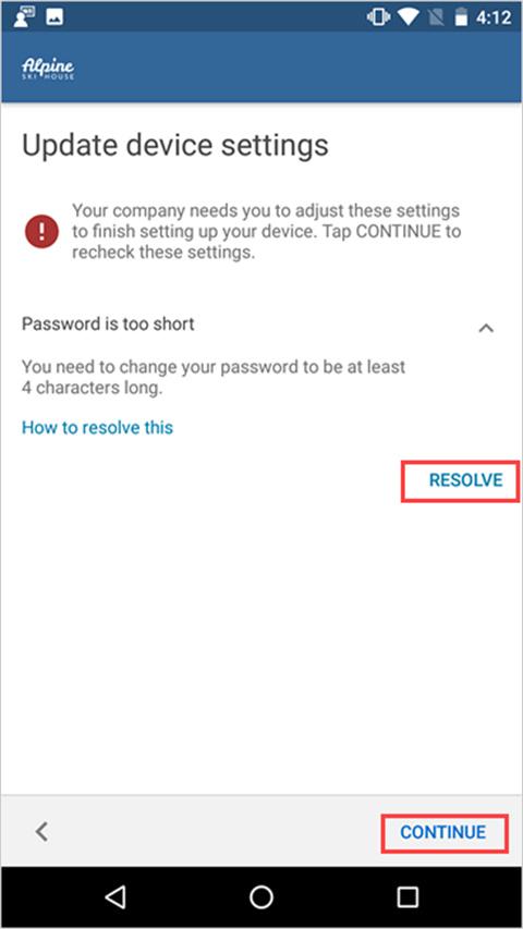 8、组织可能要求你更新设备设置。 点击“ 解决 ”以调整设置。 完成设置更新后,点击“ 继续”。