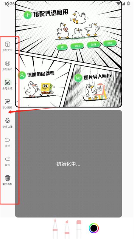 4、进入绘画页面,可以添加角色参考,将图片导入画布等,各种绘画工具都能免费使用