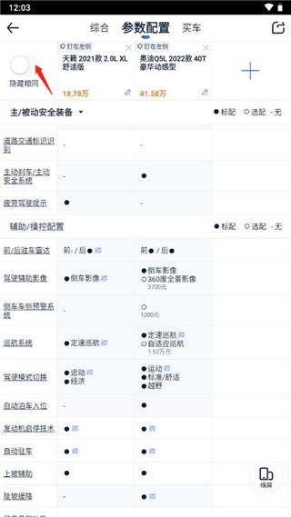 6、这样在打开的页面,系统就会列出两款车型的详细对比了;