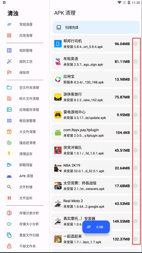 5、扫描完成后,软件会列出手机中所有的APK文件。您可以根据需要选择要删除的软件或游戏。