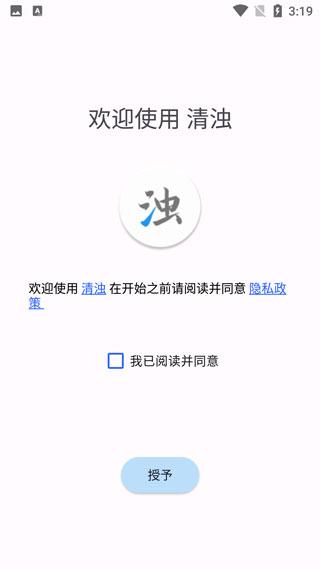 1、在本站下载并安装清浊App后,首次打开软件时,系统会提示授权,请点击“同意”以进入应用。