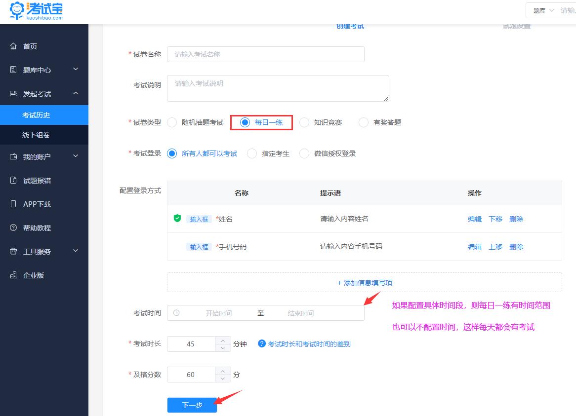 第二步、配置考试的基础信息,选择每日一练