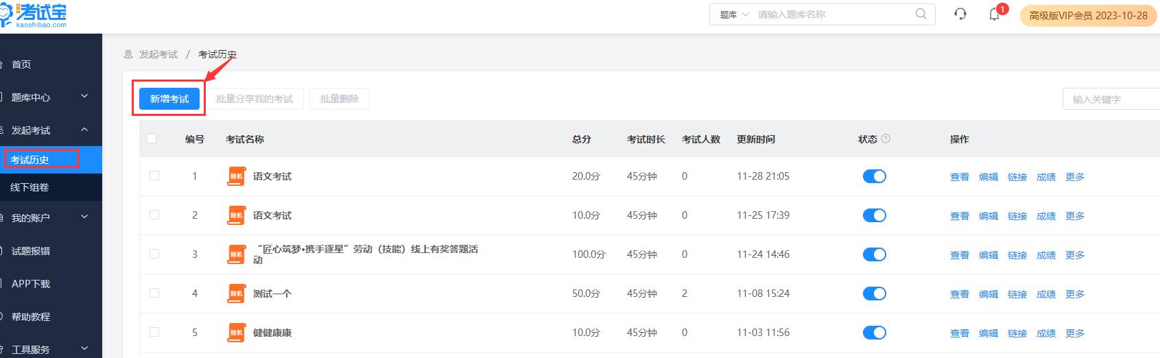 第一步、点击考试是考试中心-考试管理,点击右上角【发起考试--考试历史】,点击[新增考试]