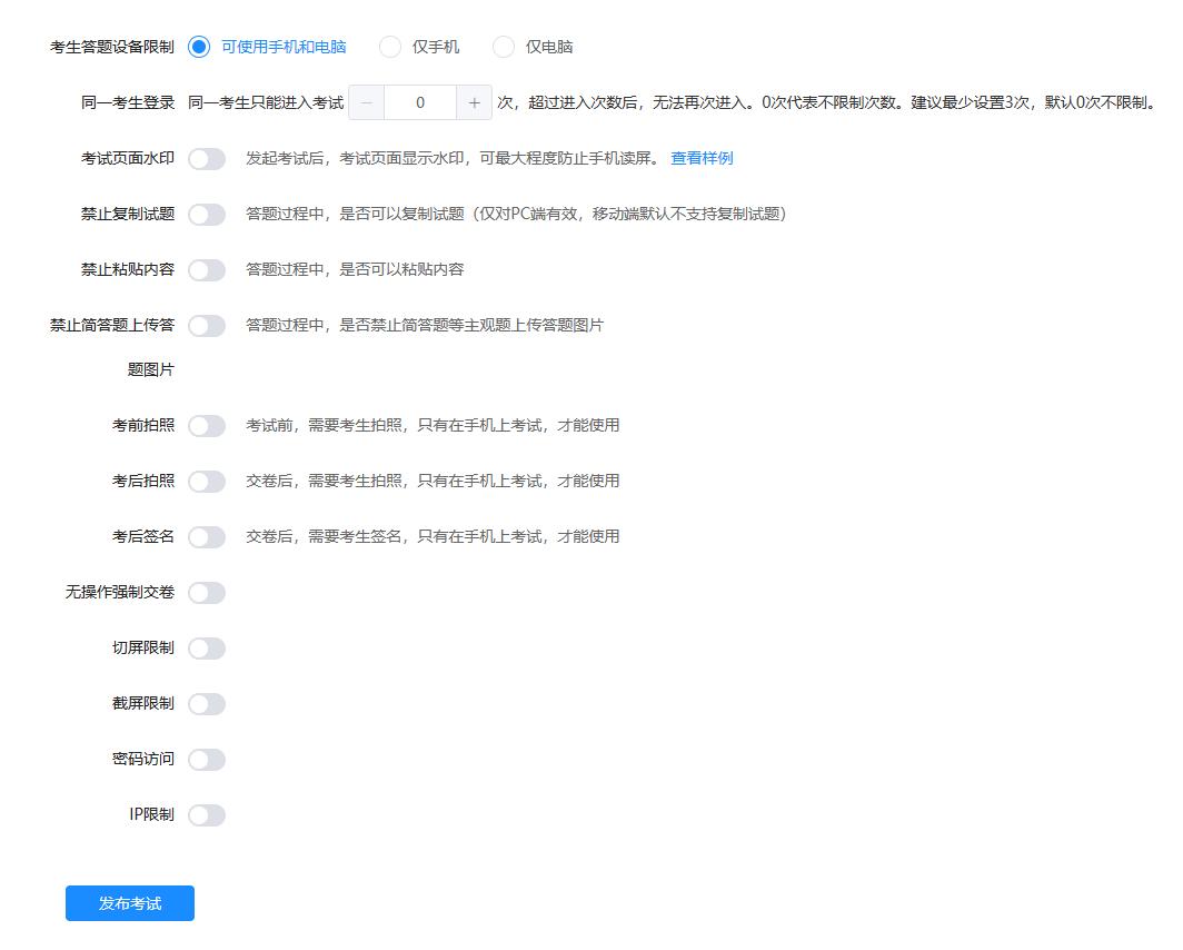 第五步、根据需要,配置防作弊。然后点击发布考试。