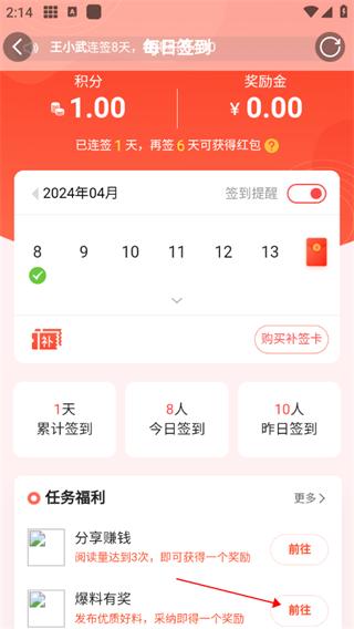 2、进入每日签到界面找到爆料有奖,点击前往。