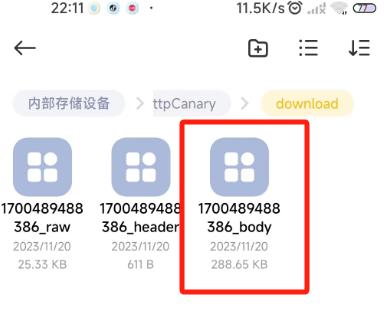 保存响应的目录再手机内httpcanary文件夹,download内老样子,直接找最大KB数文件